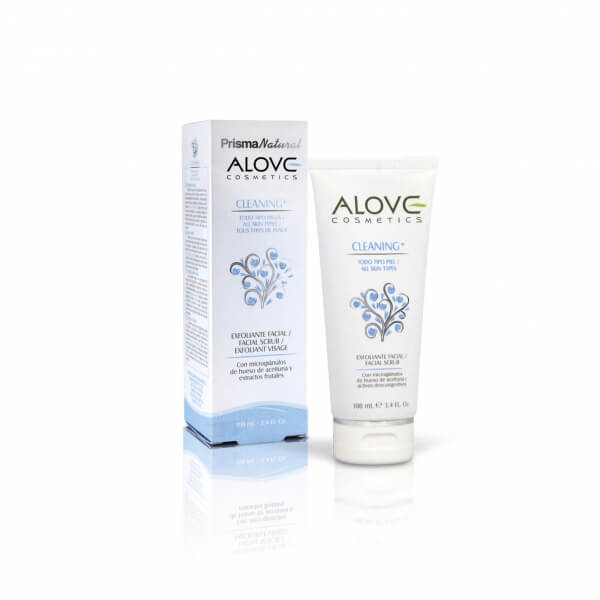 Exfoliante facial de alove con microgránulos de hueso de aceituna y activos descongestivos. Ideal para todo tipo de pieles
